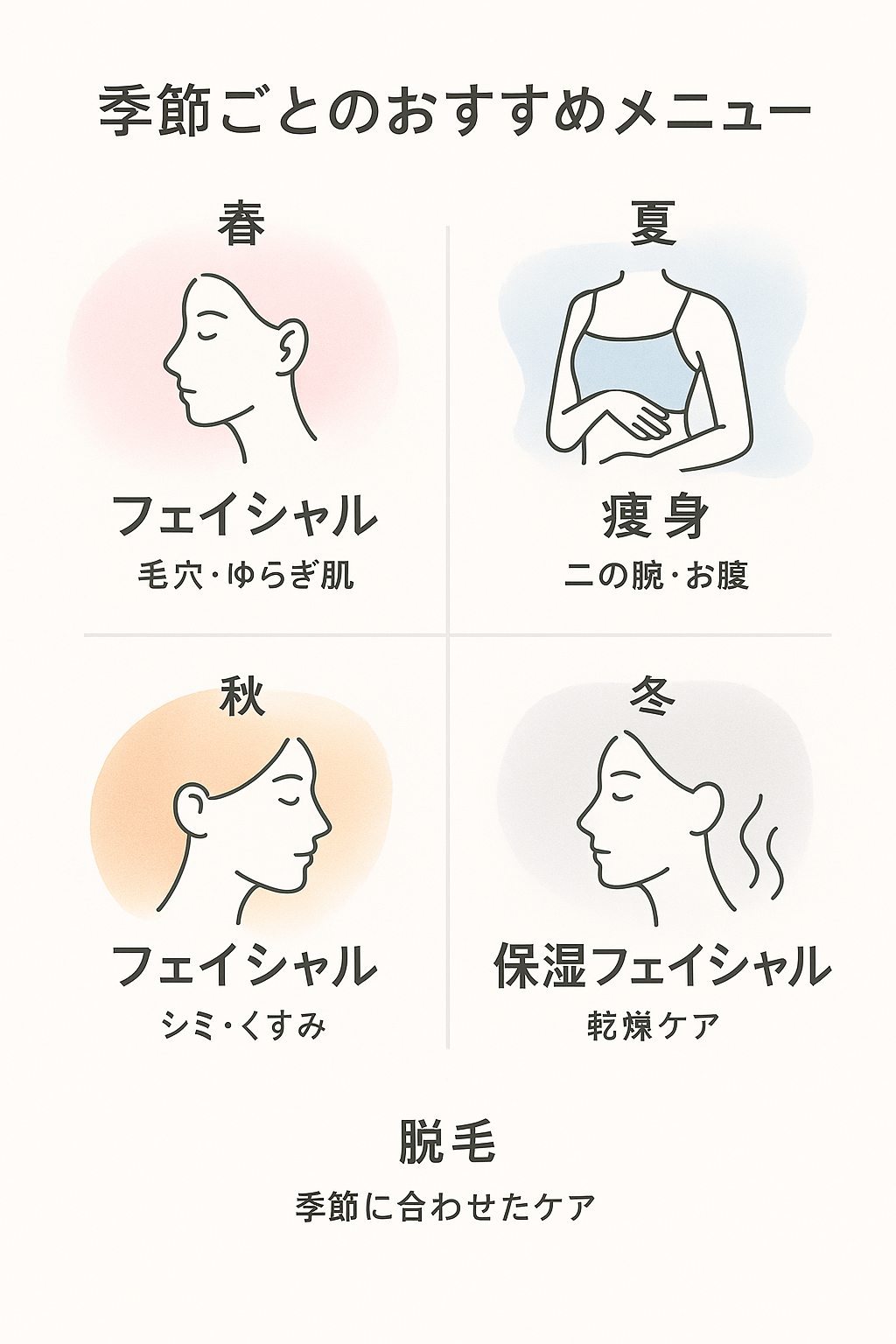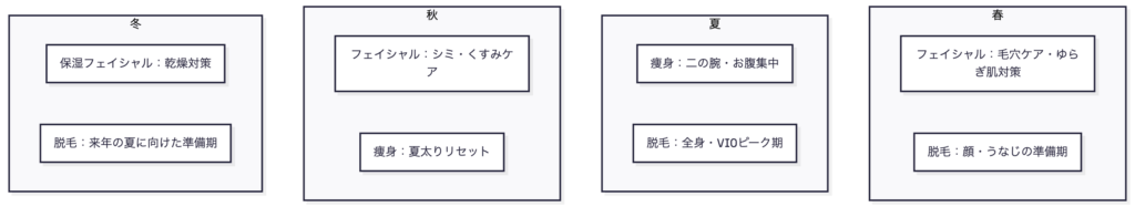 | 脱毛(季節別) | 全年代/ムダ毛・自己処理負担 | 30〜90分 | ¥4,000〜¥20,000 | 施術後のつるすべ感 |